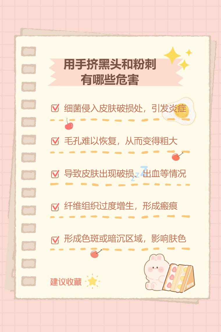 用手挤黑头和粉刺可能引发皮肤感染、毛孔粗大、皮肤损伤、形成瘢痕、色素沉着等危害。