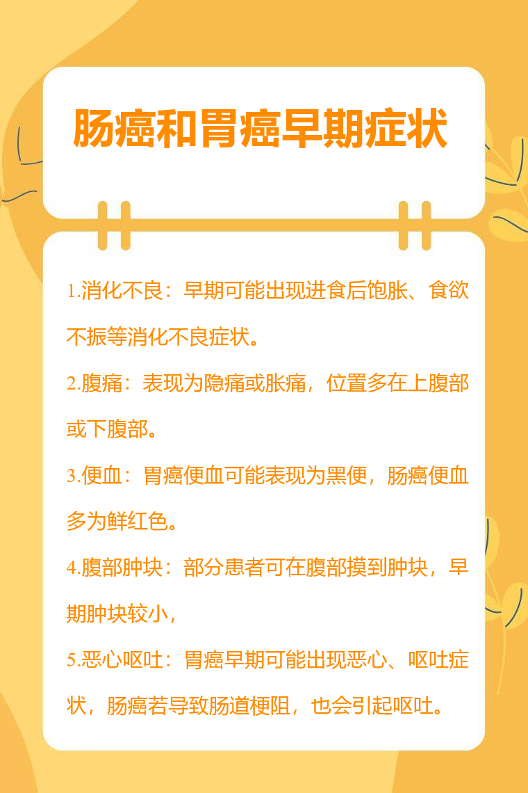 肠癌和胃癌早期症状包括消化不良、腹痛、便血、腹部肿块、恶心呕吐等。
