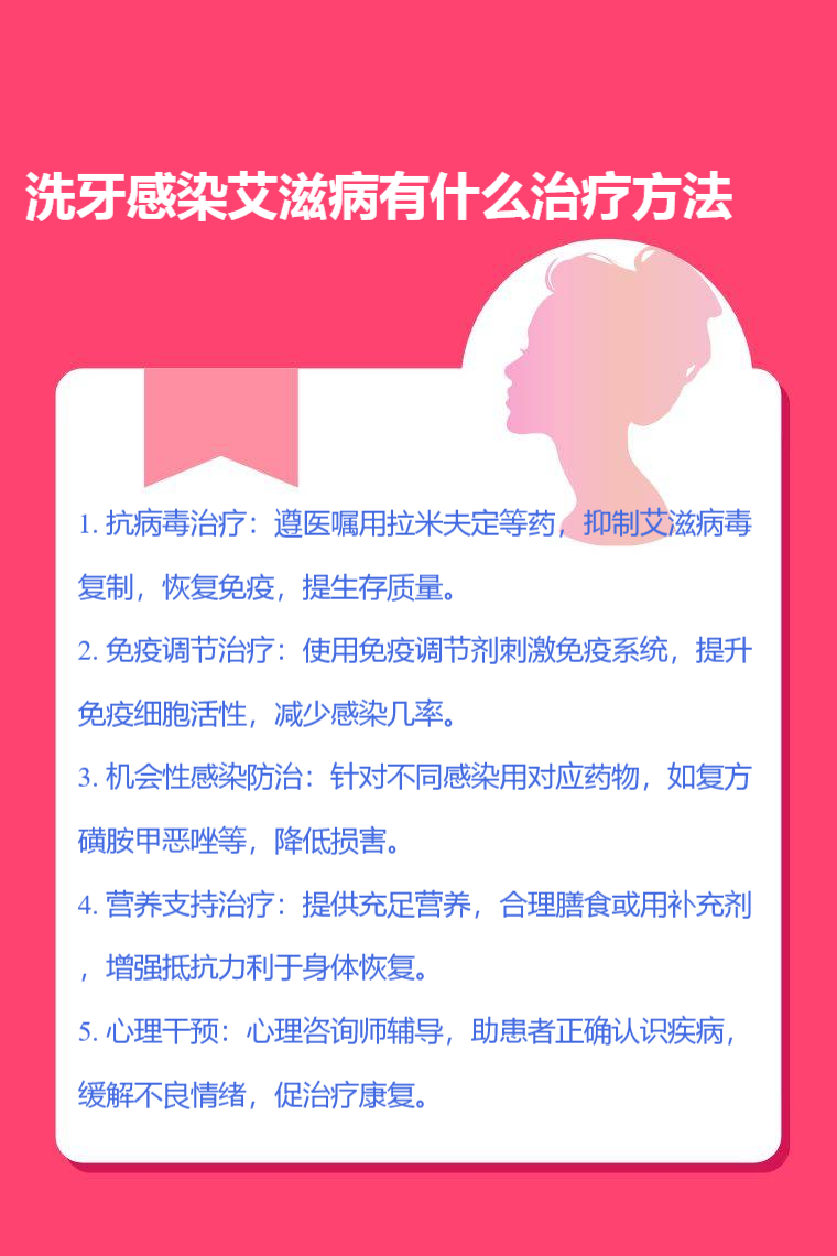 洗牙感染艾滋病可通过抗病毒治疗、免疫调节治疗、机会性感染防治、营养支持治疗、心理干预等方法进行治疗。