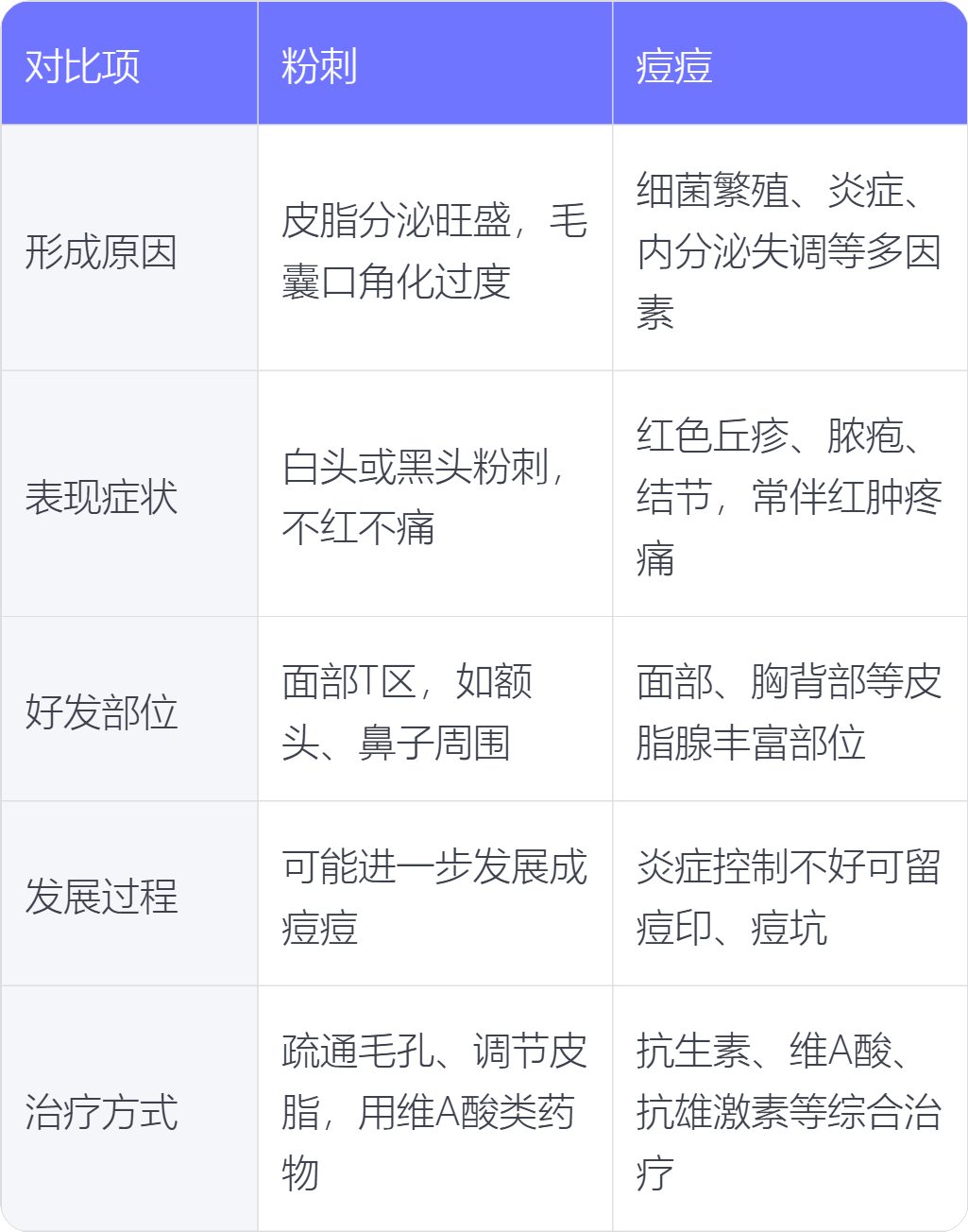 5. 治疗方式:粉刺治疗以疏通毛孔、调节皮脂分泌为主,可使用维A酸类药物。痘痘治疗则需根据不同类型和严重程度,综合使用抗生素、维A酸类药物、抗雄激素药物等,还可能配合物理治疗。