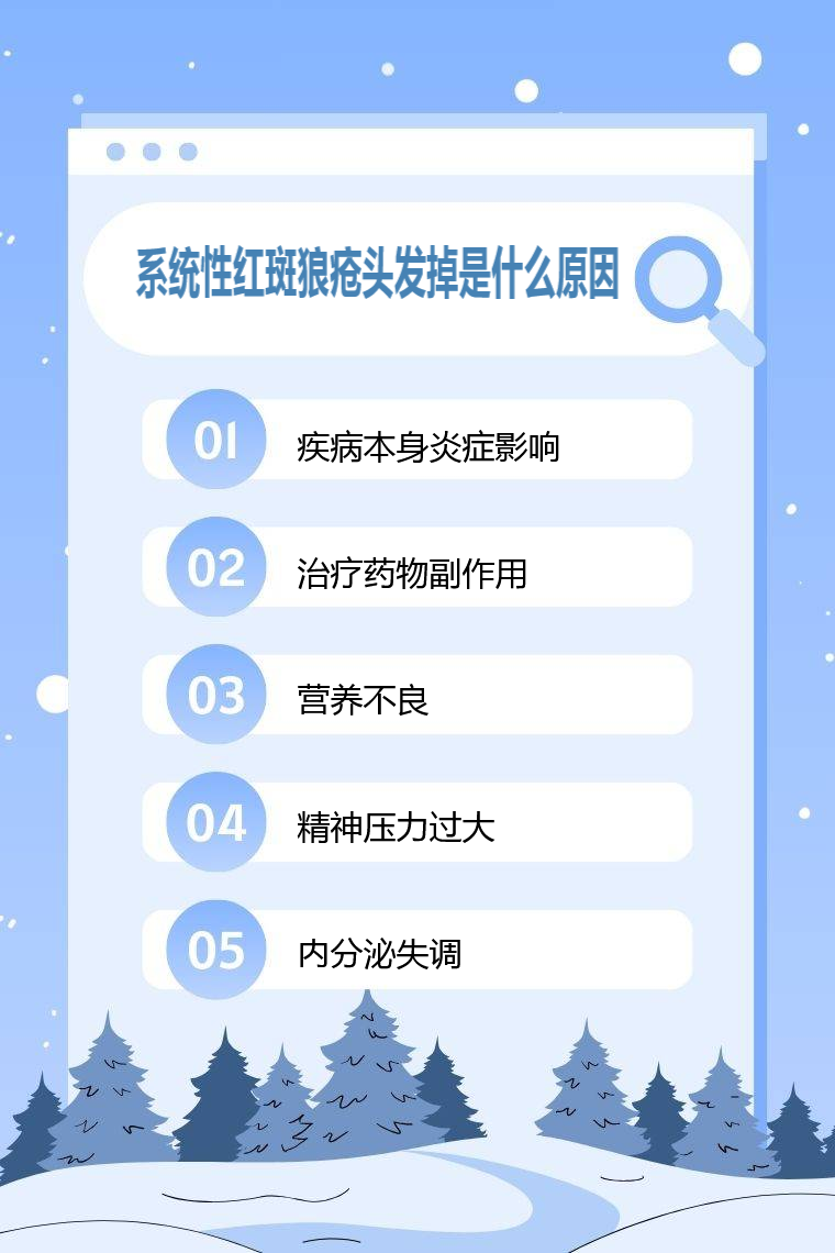 系统性红斑狼疮头发掉常见原因有疾病本身炎症影响、治疗药物副作用、营养不良、精神压力过大、内分泌失调等。