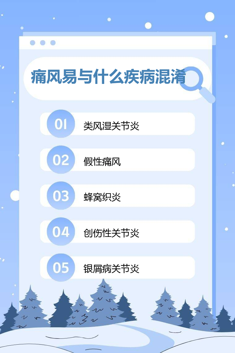 痛风易与类风湿关节炎、假性痛风、蜂窝织炎、创伤性关节炎、银屑病关节炎等混淆。
