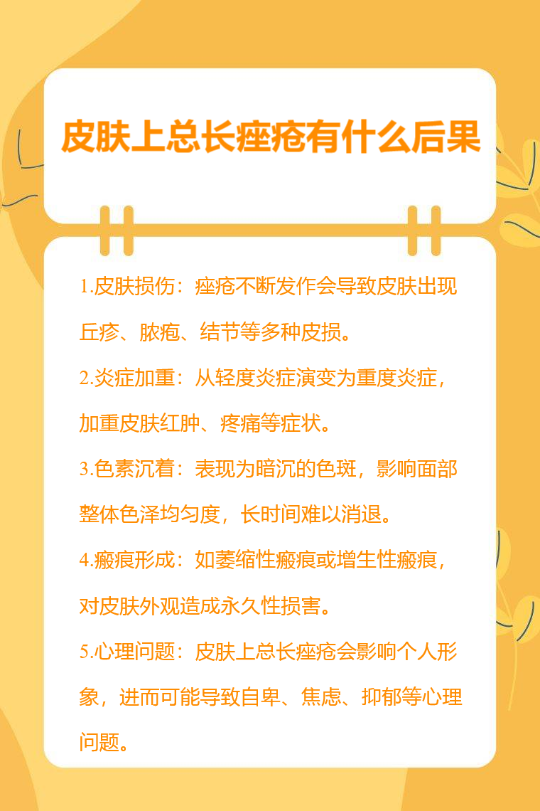 皮肤上总长痤疮可能出现皮肤损伤、炎症加重、色素沉着、瘢痕形成、心理问题等。