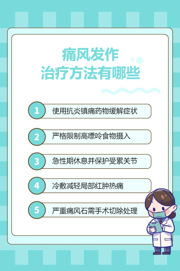 痛风发作的治疗方法有药物治疗、饮食控制、休息与关节保护、物理治疗、手术治疗等。