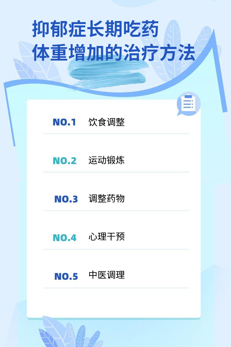 抑郁症长期吃药体重增加可通过饮食调整、运动锻炼、调整药物、心理干预、中医调理等方法改善。