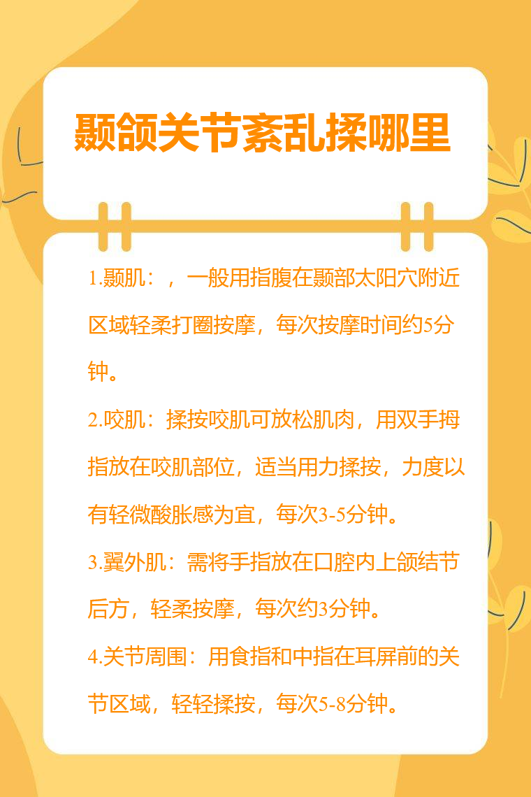 颞颌关节紊乱可揉的部位有颞肌、咬肌、翼外肌、关节周围。