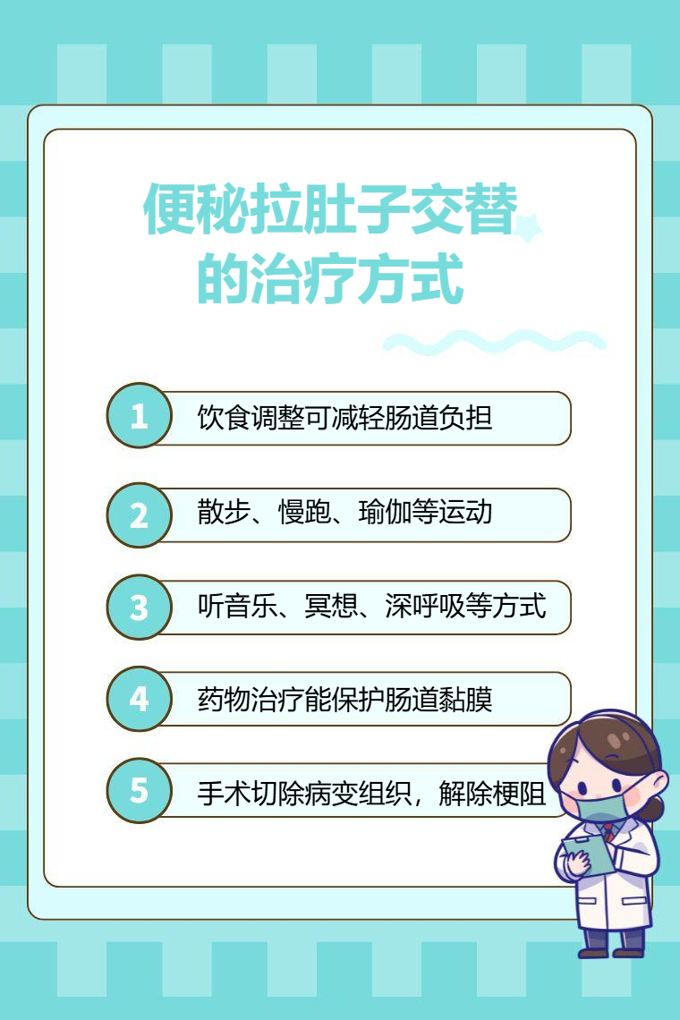 便秘拉肚子交替可通过饮食调整、生活方式改善、心理调节、药物治疗、手术治疗等方式进行治疗。