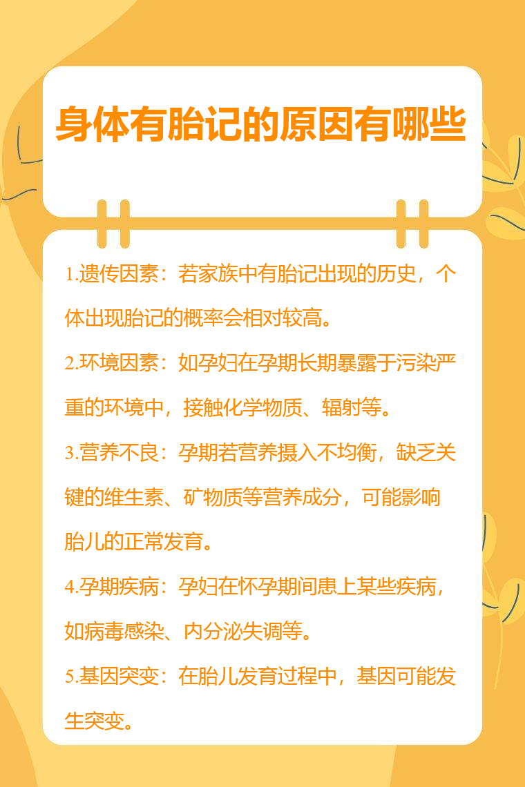 身体有胎记的原因有遗传因素、环境因素、营养不良、孕期疾病、基因突变等。