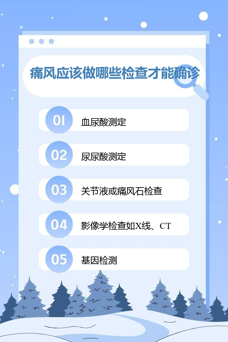 痛风确诊通常需进行血尿酸测定、尿尿酸测定、关节液或痛风石检查、影像学检查、基因检测等。