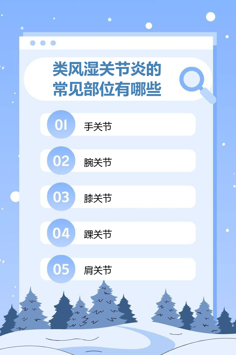 类风湿关节炎常见部位有手关节、腕关节、膝关节、踝关节、肩关节等。