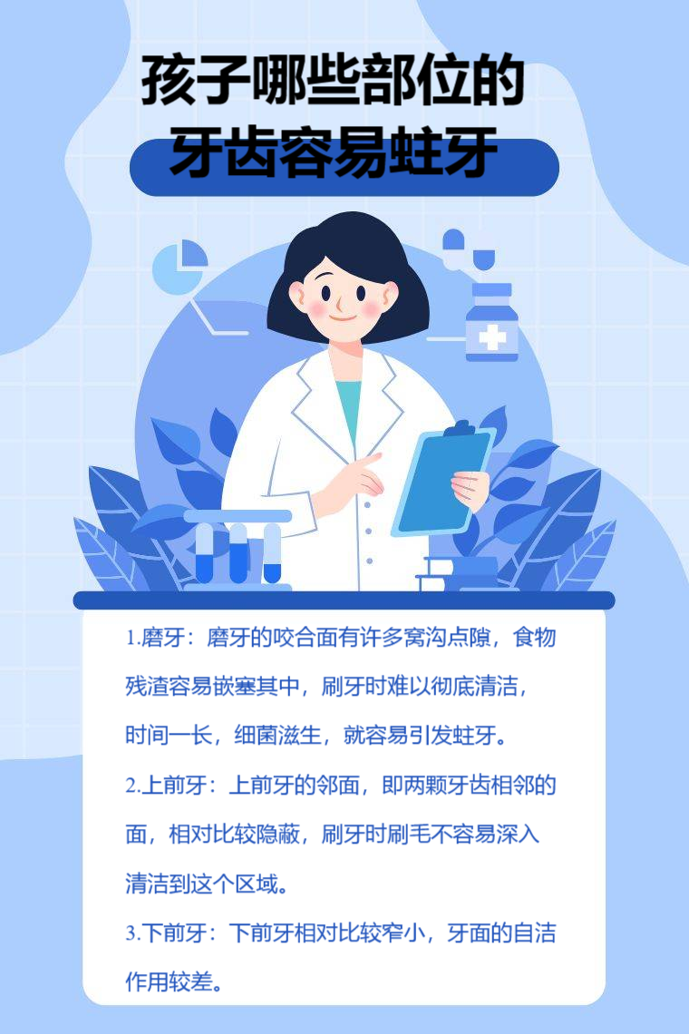 孩子的磨牙、上前牙、下前牙等部位容易蛀牙。