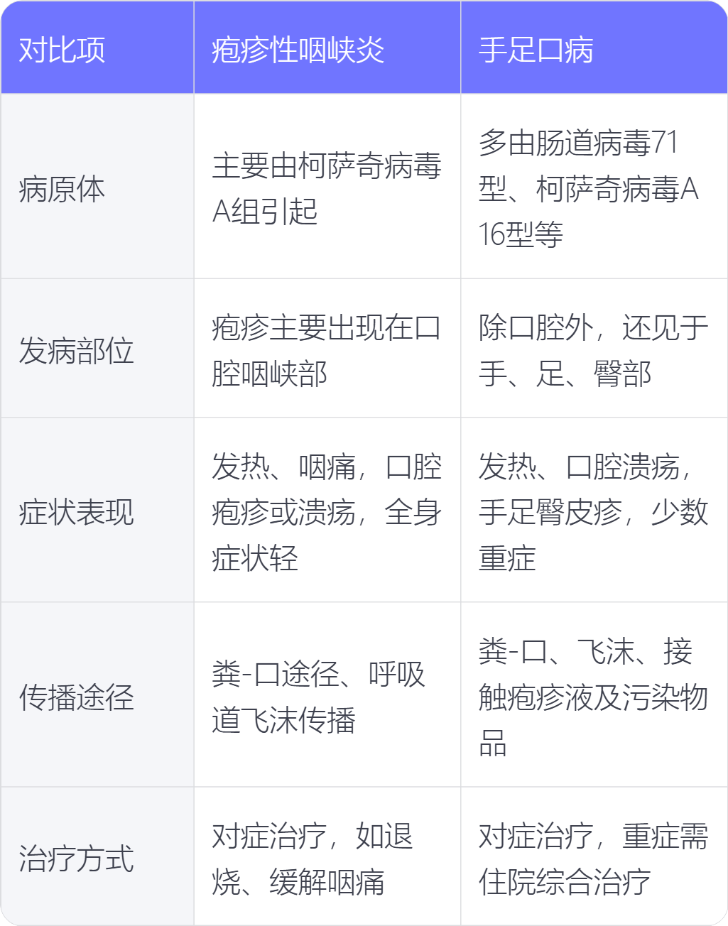 疱疹性咽峡炎和手足口病在病原体、发病部位、症状表现、传播途径、治疗方式上存在不同。