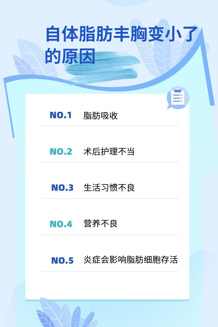 自体脂肪丰胸后变小常见原因有脂肪吸收、术后护理不当、生活习惯不良、营养不良、感染等。