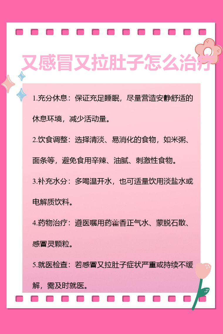 感冒又拉肚子可通过休息、饮食调整、补充水分、药物治疗、就医检查等方法进行治疗。