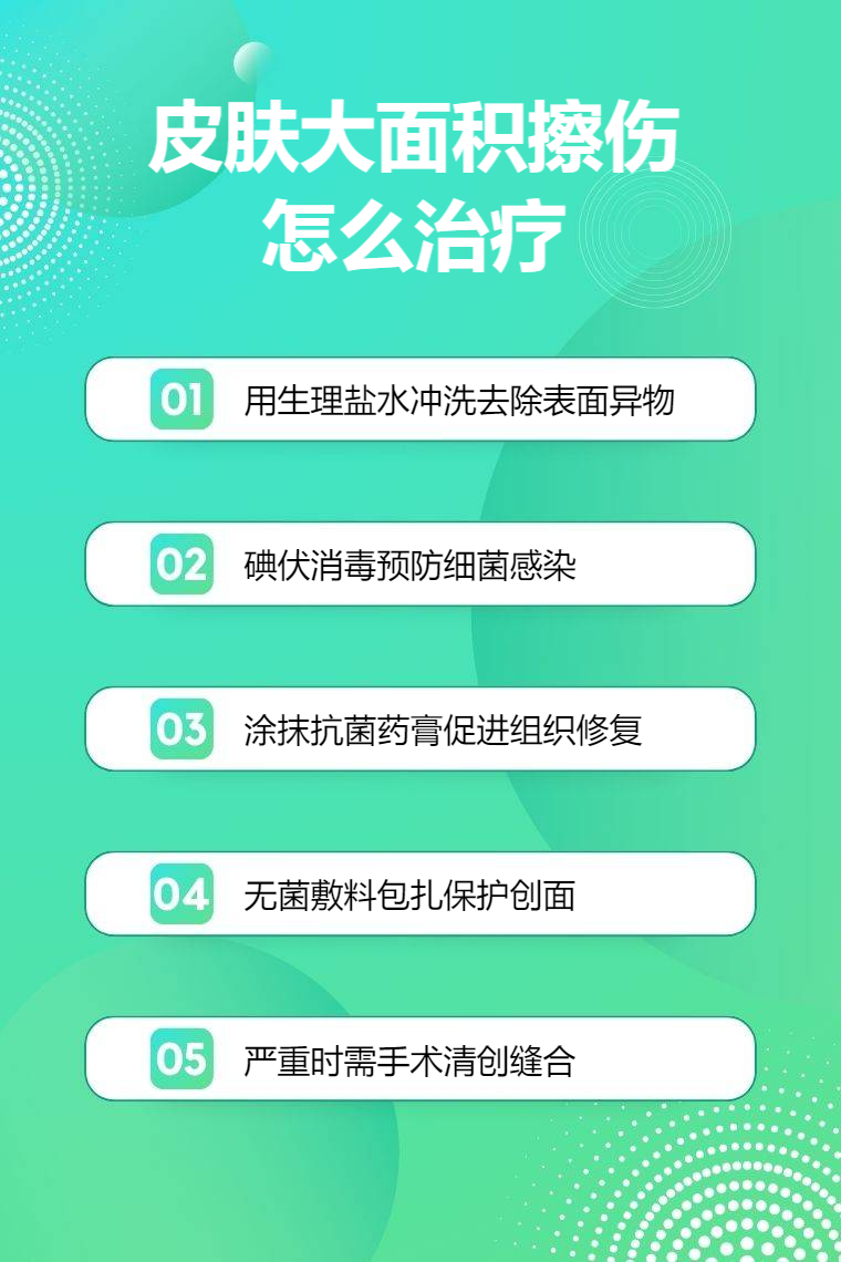 皮肤大面积擦伤的治疗方法主要有清洁伤口、消毒处理、涂抹药物、包扎伤口、手术治疗等。