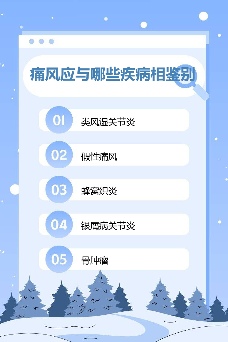 痛风应与类风湿关节炎、假性痛风、蜂窝织炎、银屑病关节炎、骨肿瘤等相鉴别。