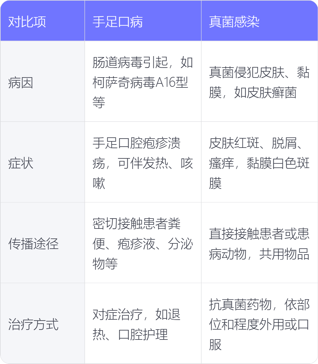 手足口病与真菌感染在病因、症状、传播途径、治疗方式上存在不同。