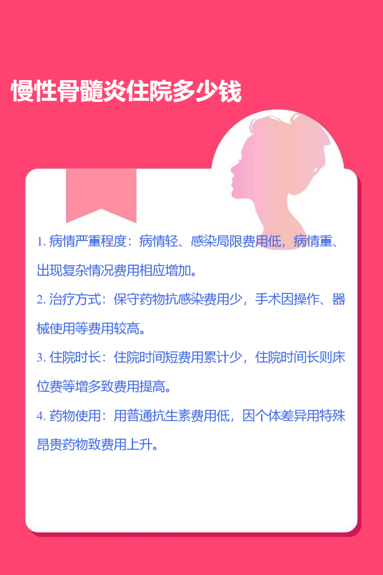 慢性骨髓炎住院费用因多种因素而异,一般在10000元到50000元之间,存在个体差异性。影响费用的因素有病情严重程度、治疗方式、住院时长、药物使用 。