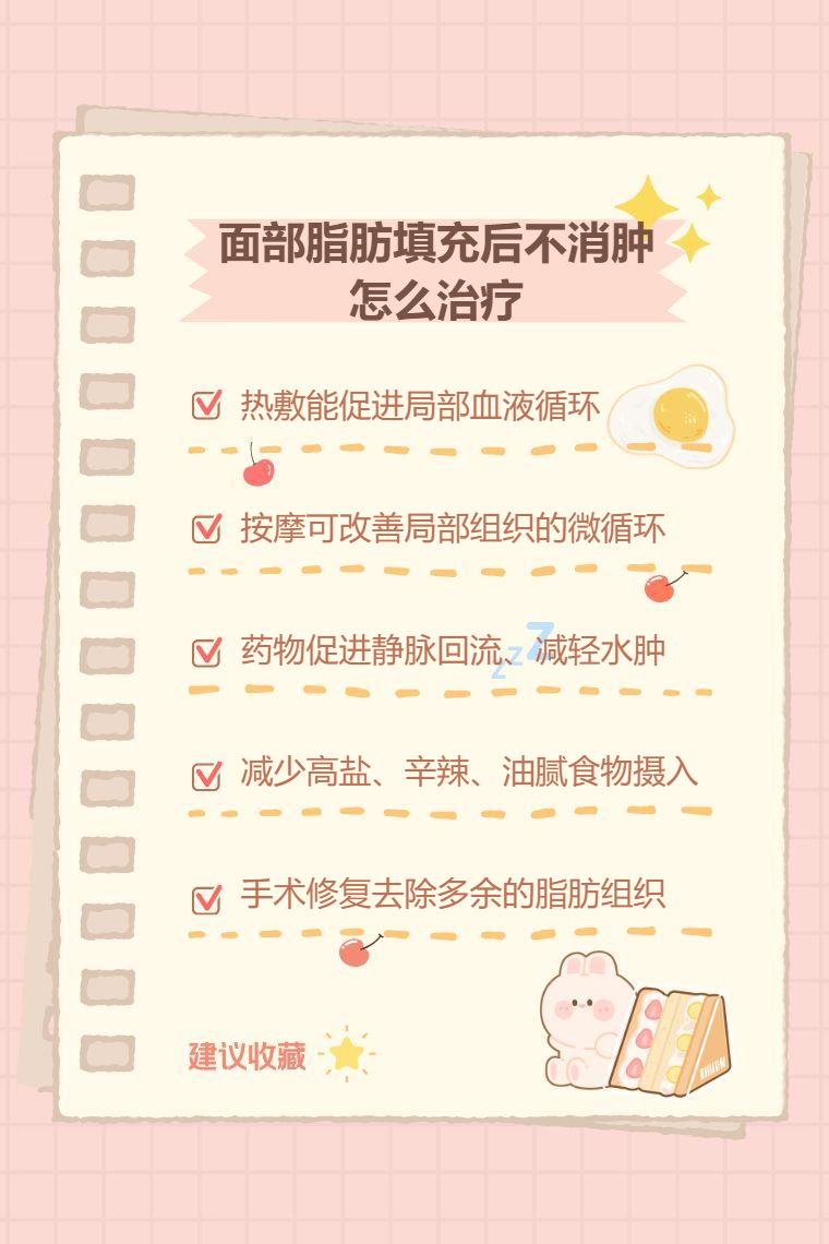 面部脂肪填充后不消肿可通过热敷、按摩、服用消肿药物、调整饮食、手术修复等方法来治疗。