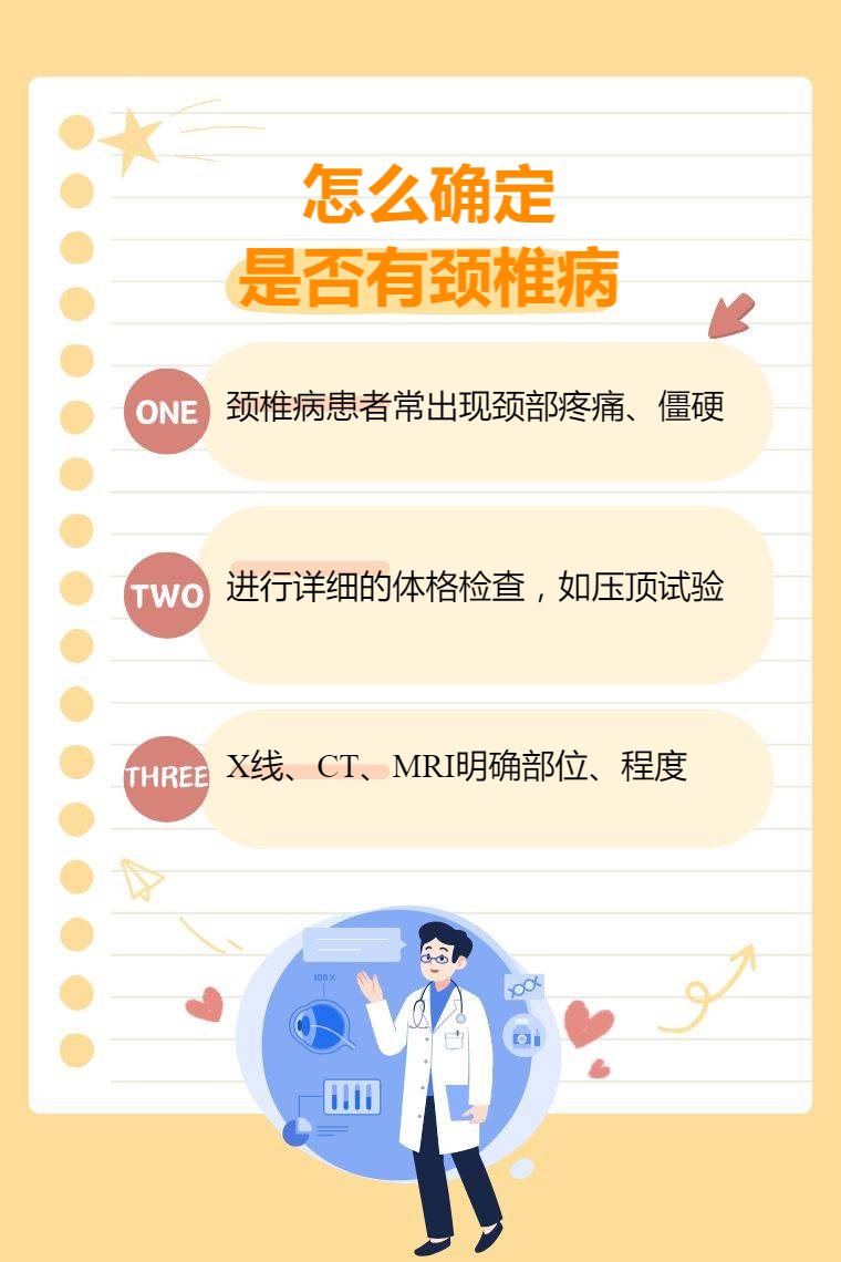 确定是否有颈椎病可通过症状表现、体格检查、影像学检查等。