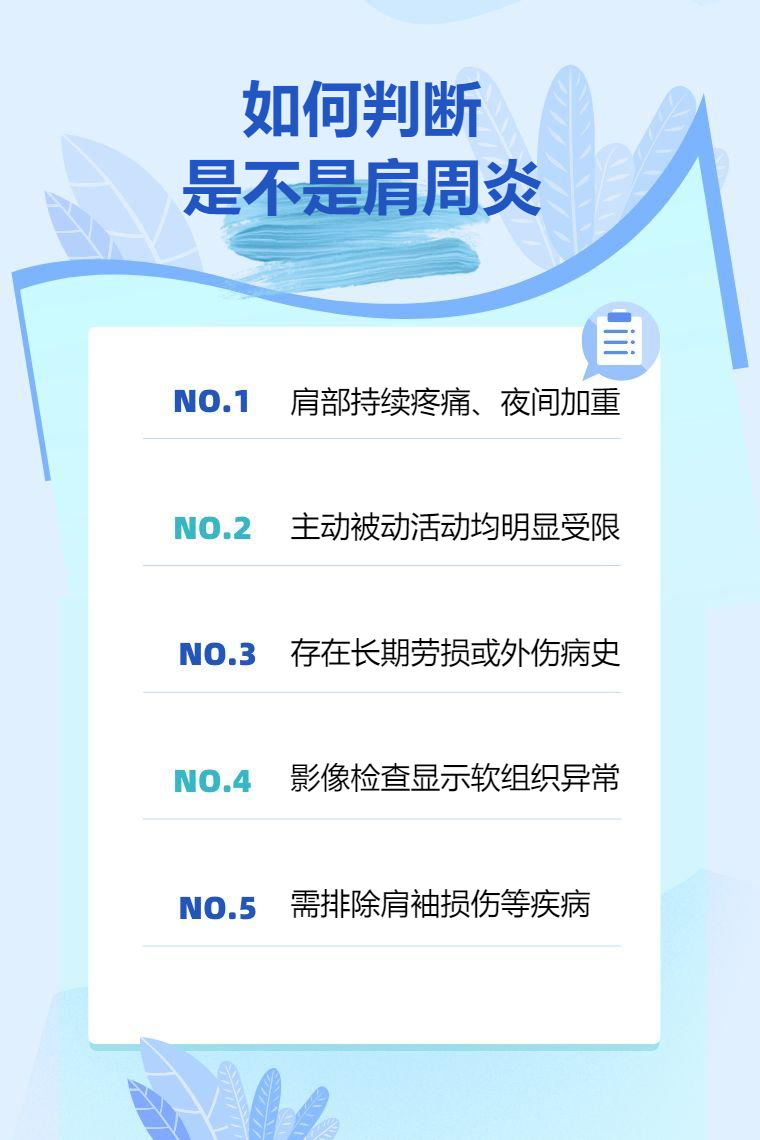5. 排除其他疾病:需要与肩部的其他疾病如肩袖损伤、肱二头肌长头肌腱炎、颈椎病等相鉴别,通过详细的症状分析、体征检查及相关辅助检查来准确判断。