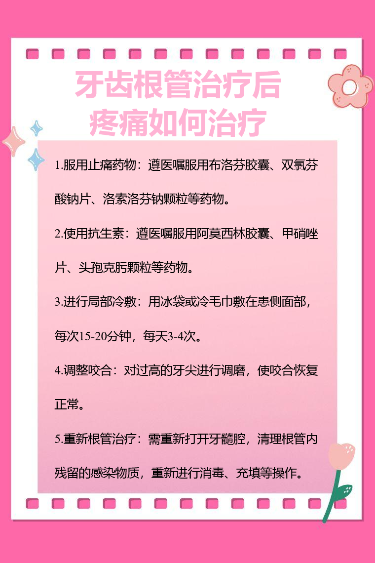 牙齿根管治疗后疼痛可通过服用止痛药物、使用抗生素、进行局部冷敷、调整咬合、重新根管治疗等方法缓解。