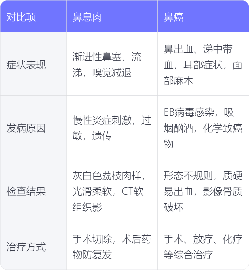 鼻息肉和鼻癌可从症状表现、发病原因、检查结果、治疗方式来区分。