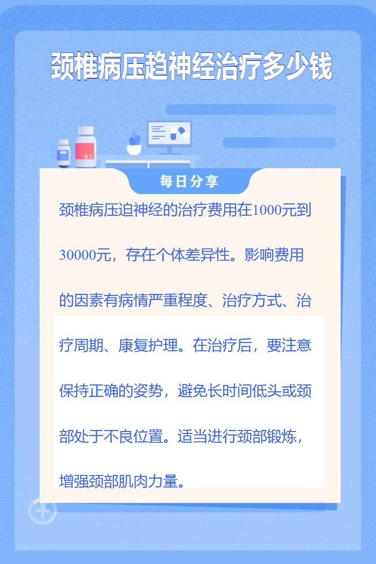 颈椎病压迫神经的治疗费用在1000元到30000元,存在个体差异性。影响费用的因素有病情严重程度、治疗方式、治疗周期、康复护理。