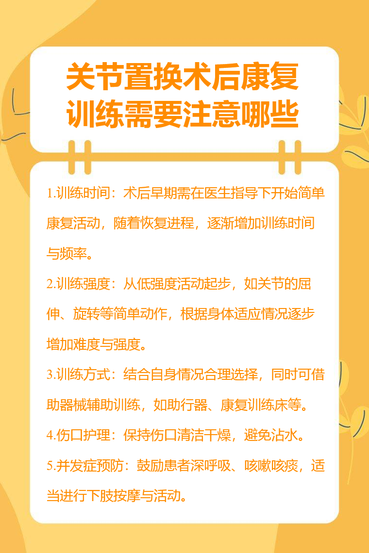 关节置换术后康复训练需要注意训练时间、训练强度、训练方式、伤口护理、并发症预防等。