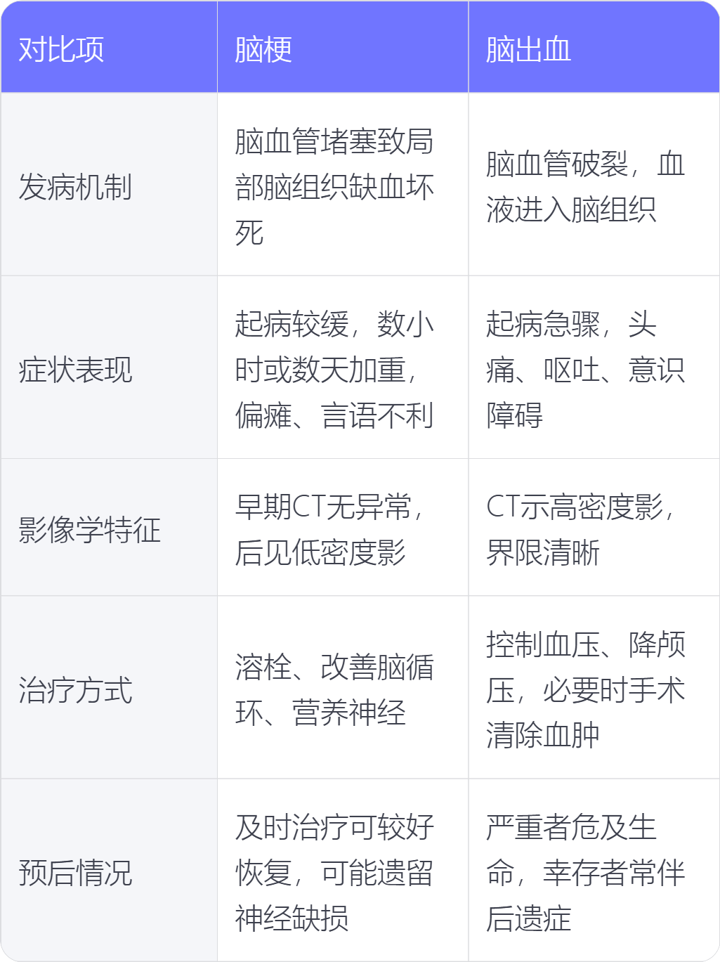 脑梗和脑出血在发病机制、症状表现、影像学特征、治疗方式、预后情况上存在不同。