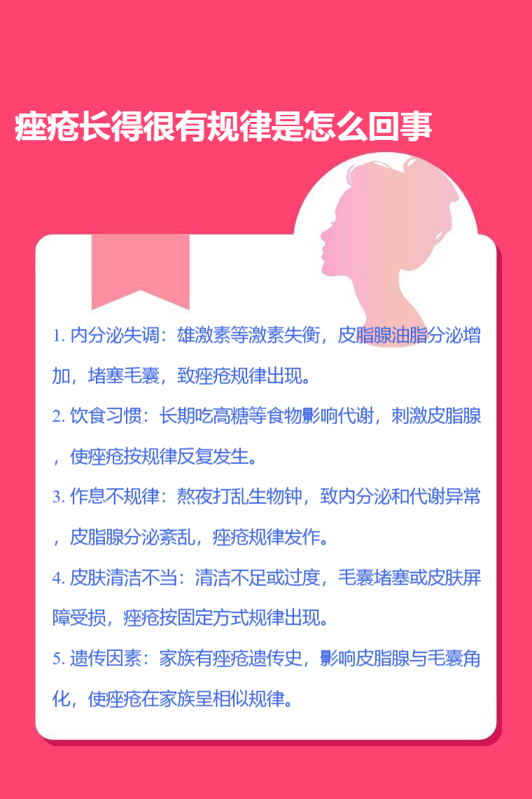 痤疮长得很有规律可能与内分泌失调、饮食习惯、作息不规律、皮肤清洁不当、遗传因素等有关。