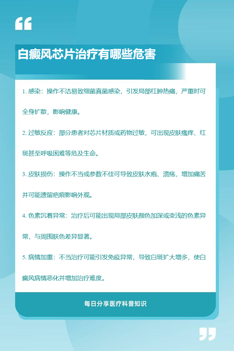 白癜风芯片治疗可能存在感染、过敏反应、皮肤损伤、色素沉着异常、病情加重等危害。