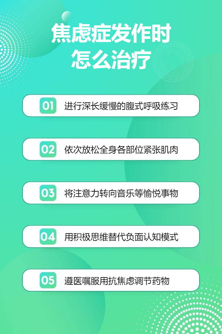 焦虑症发作时可通过深呼吸、放松肌肉、转移注意力、心理调节、药物治疗等方法缓解。