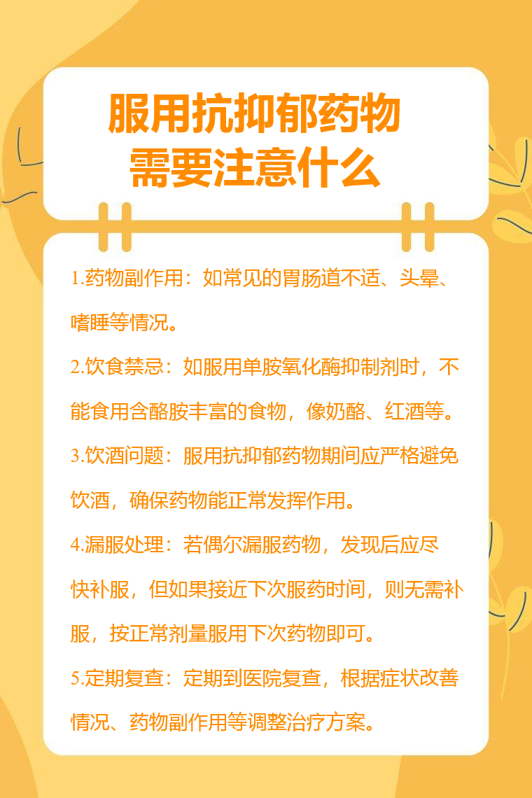 服用抗抑郁药物需要注意药物副作用、饮食禁忌、饮酒问题、漏服处理、定期复查等。