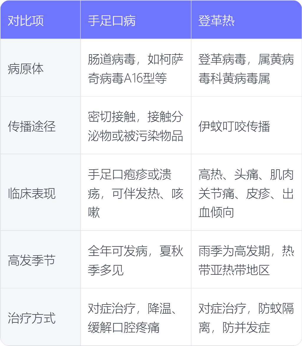 手足口病和登革热在病原体、传播途径、临床表现、高发季节、治疗方式上存在不同。