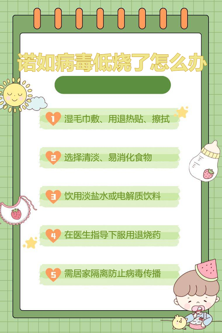诺如病毒低烧可通过物理降温、饮食调节、补充水分、药物治疗、隔离休息等应对。