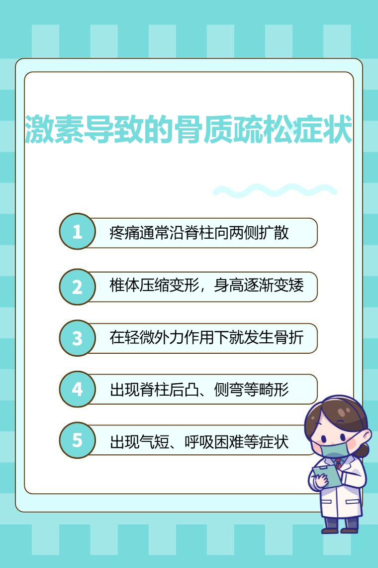 激素导致的骨质疏松症状包括疼痛、身高变矮、骨折、脊柱畸形、呼吸功能下降等。