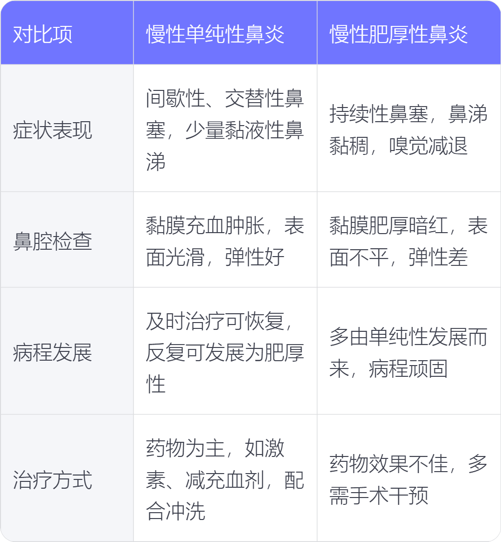 慢性鼻炎分为慢性单纯性鼻炎和慢性肥厚性鼻炎,在症状表现、鼻腔检查、病程发展、治疗方式上存在不同。