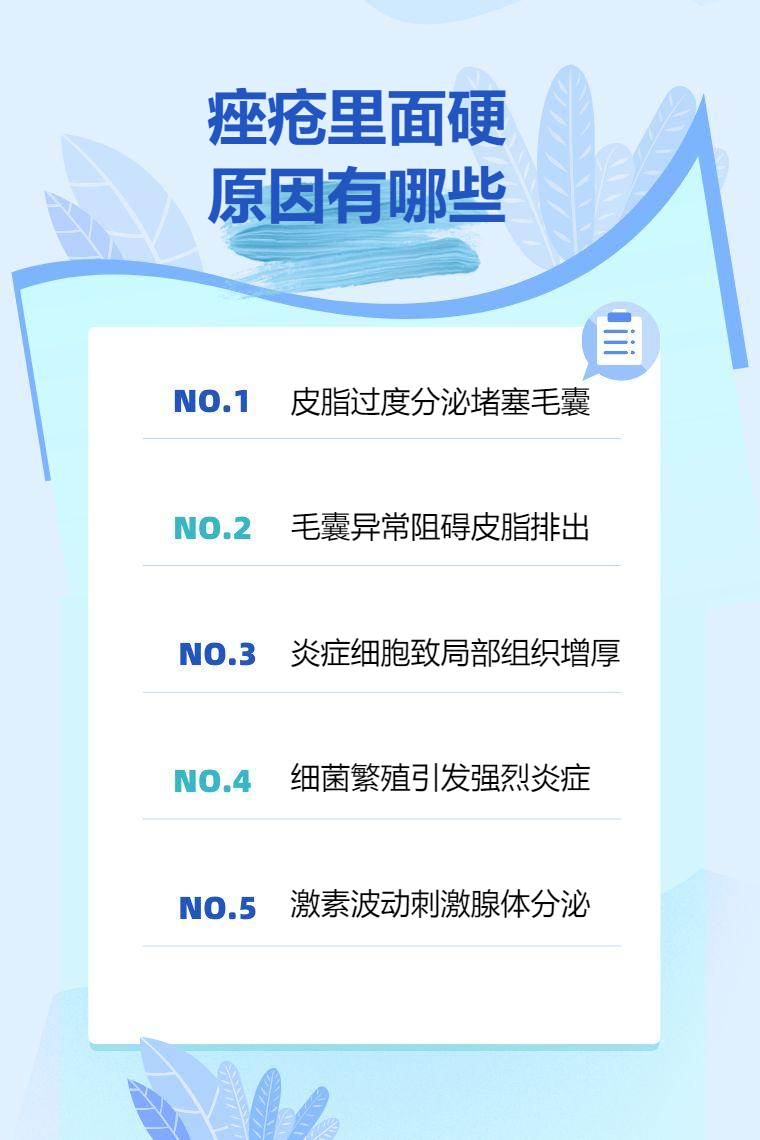 痤疮里面硬的原因有皮脂腺分泌旺盛、毛囊口角化异常、炎症反应强烈、痤疮丙酸杆菌增殖、内分泌失调等。