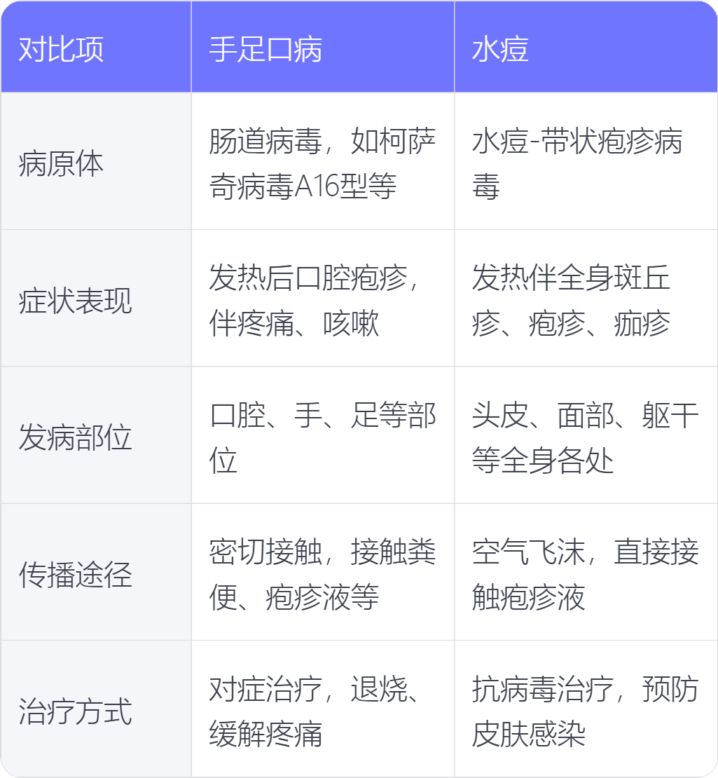 4. 传播途径:手足口病主要通过密切接触传播,如接触患者的粪便、疱疹液、呼吸道分泌物等;水痘主要通过空气飞沫传播,也可通过直接接触患者的疱疹液传播。