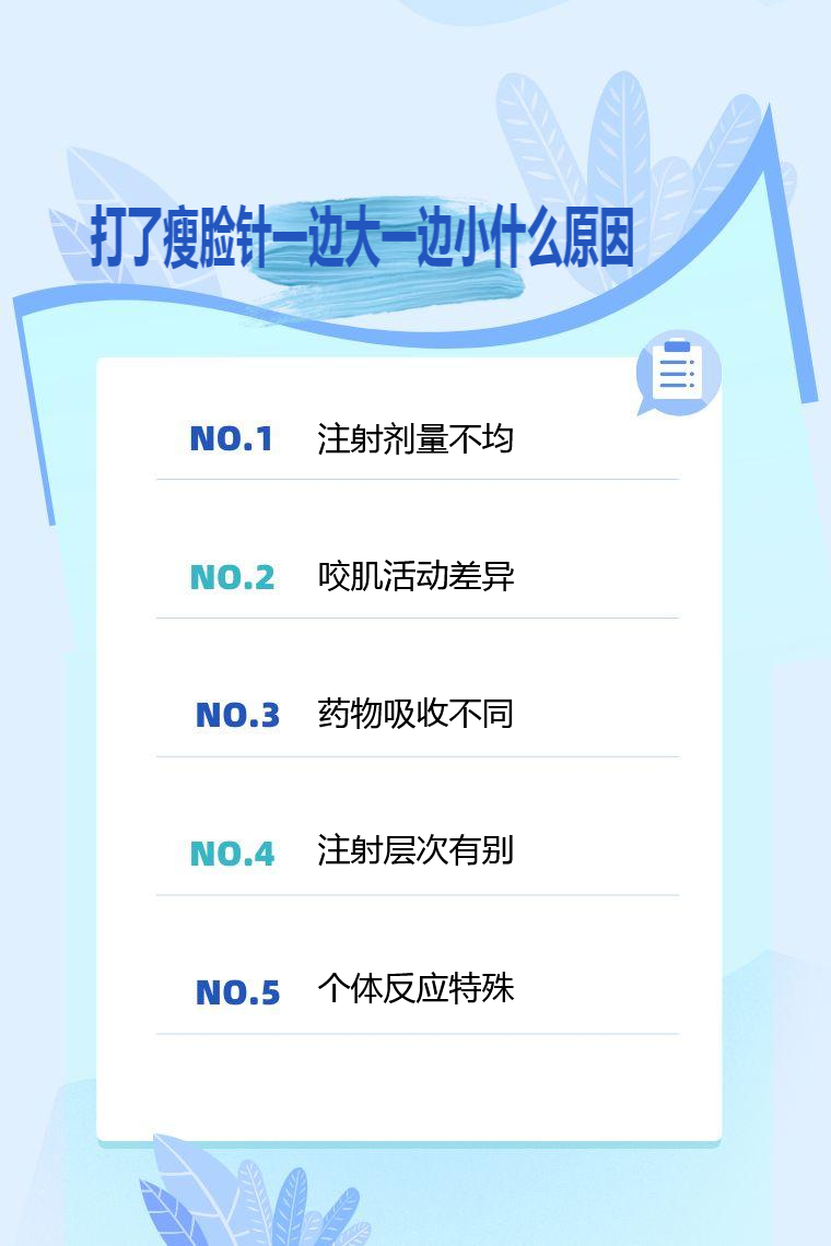 1. 注射剂量不均:注射时两边瘦脸针剂量不一致,剂量多的一侧瘦脸效果更明显,从而出现大小脸。可在恢复稳定后,对脸大一侧适当补打适量瘦脸针以调整。
