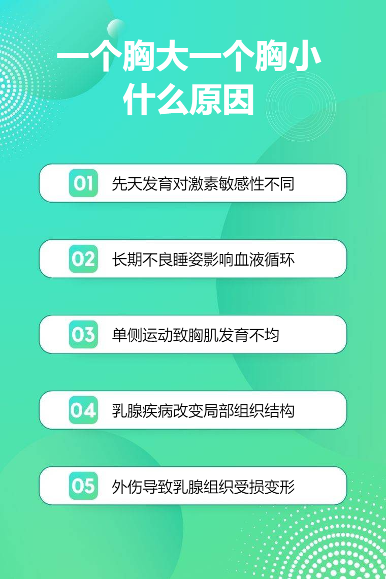 1. 先天发育差异:在乳房发育过程中,两侧乳房对激素敏感性不同,导致一侧乳房发育更好,另一侧相对较小。可通过适当按摩较小一侧乳房,促进血液循环和乳腺组织发育,同时选择合适内衣给予良好支撑。