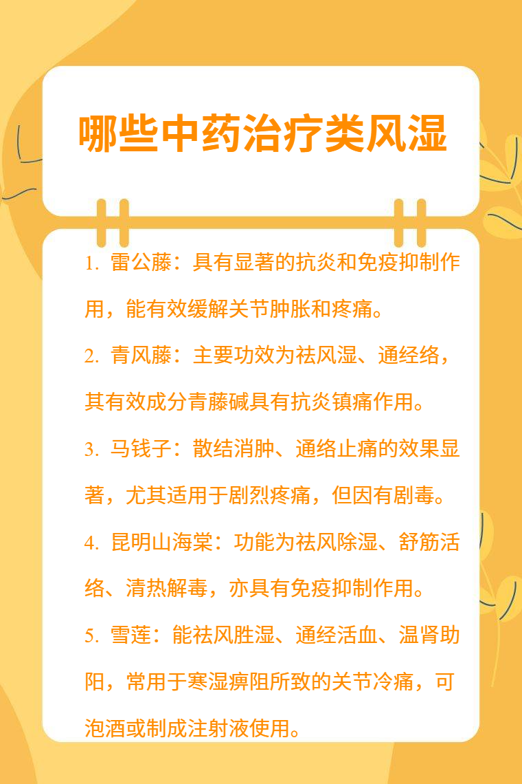 治疗类风湿的中药有雷公藤、青风藤、马钱子、昆明山海棠、雪莲等。