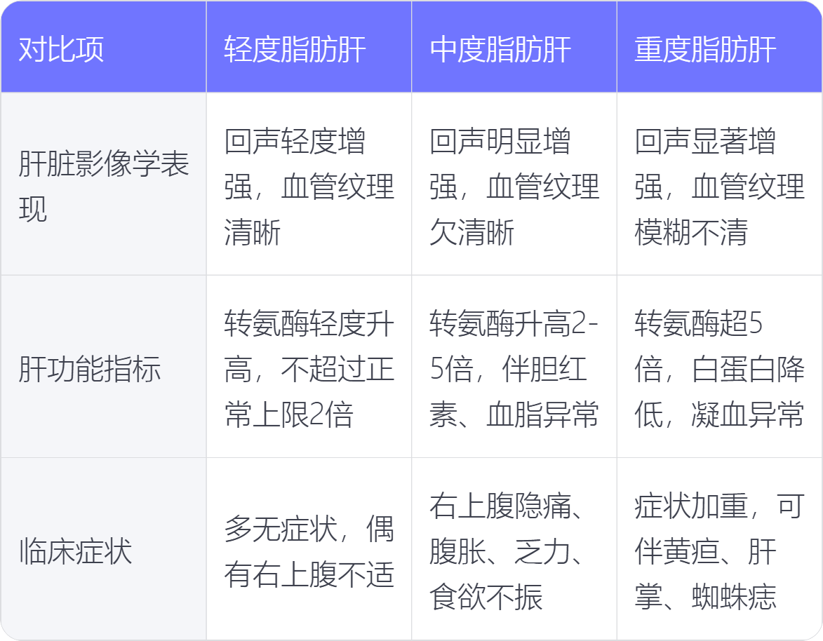 脂肪肝可通过肝脏影像学表现、肝功能指标、临床症状来判断是轻度、中度还是重度。