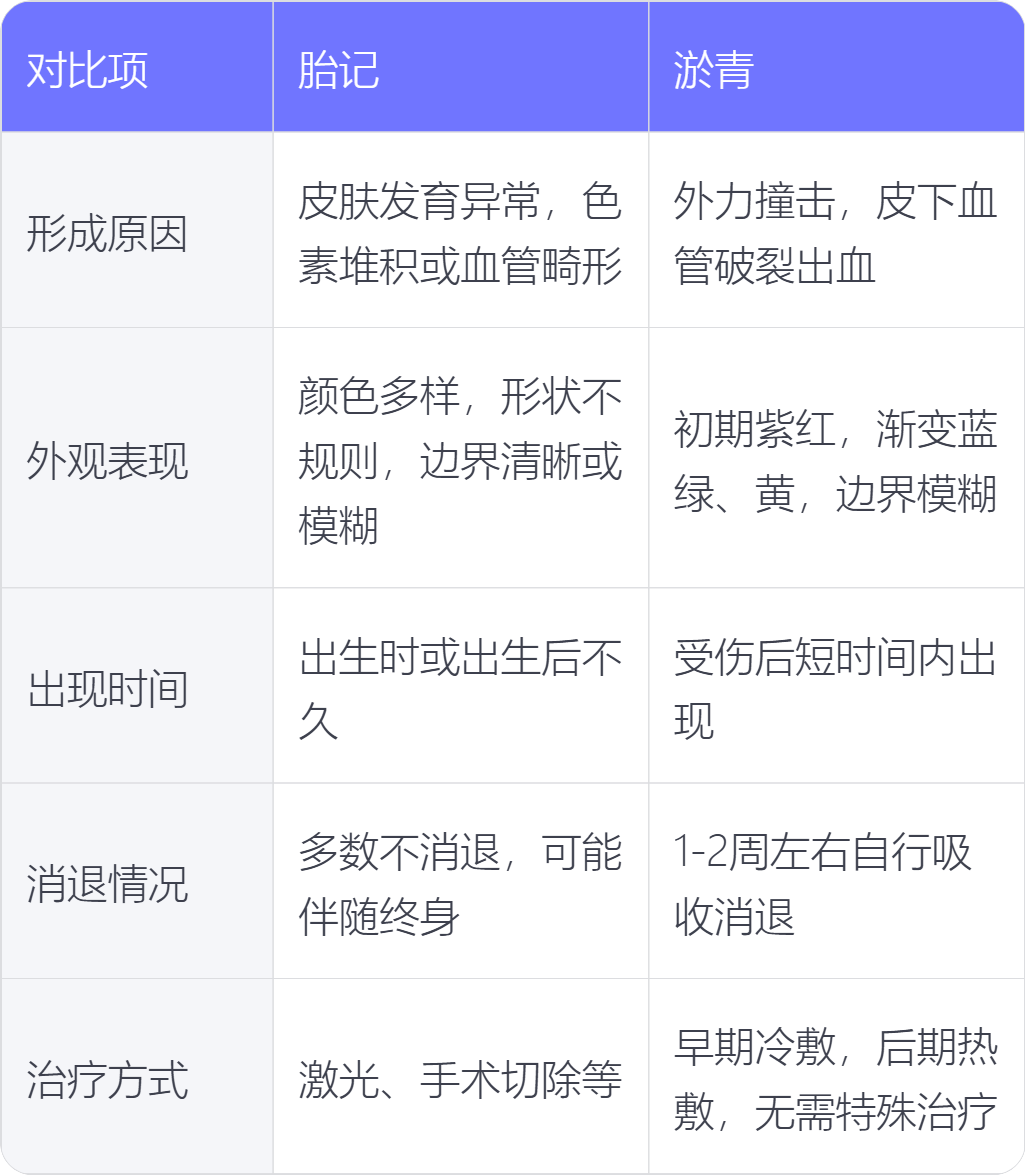 胎记和淤青在形成原因、外观表现、出现时间、消退情况、治疗方式上存在不同。