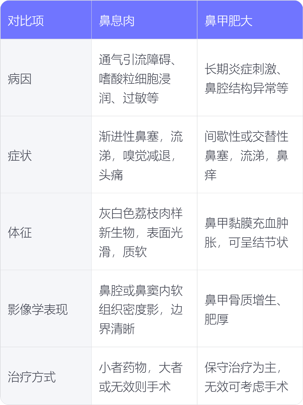 鼻息肉与鼻甲肥大在病因、症状、体征、影像学表现、治疗方式上存在不同。