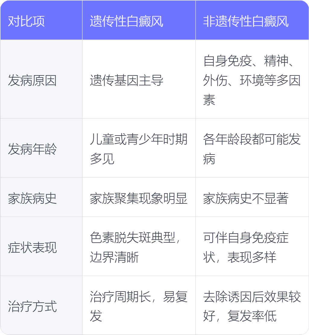 遗传性白癜风与非遗传性白癜风可从发病原因、发病年龄、家族病史、症状表现、治疗方式来区分。