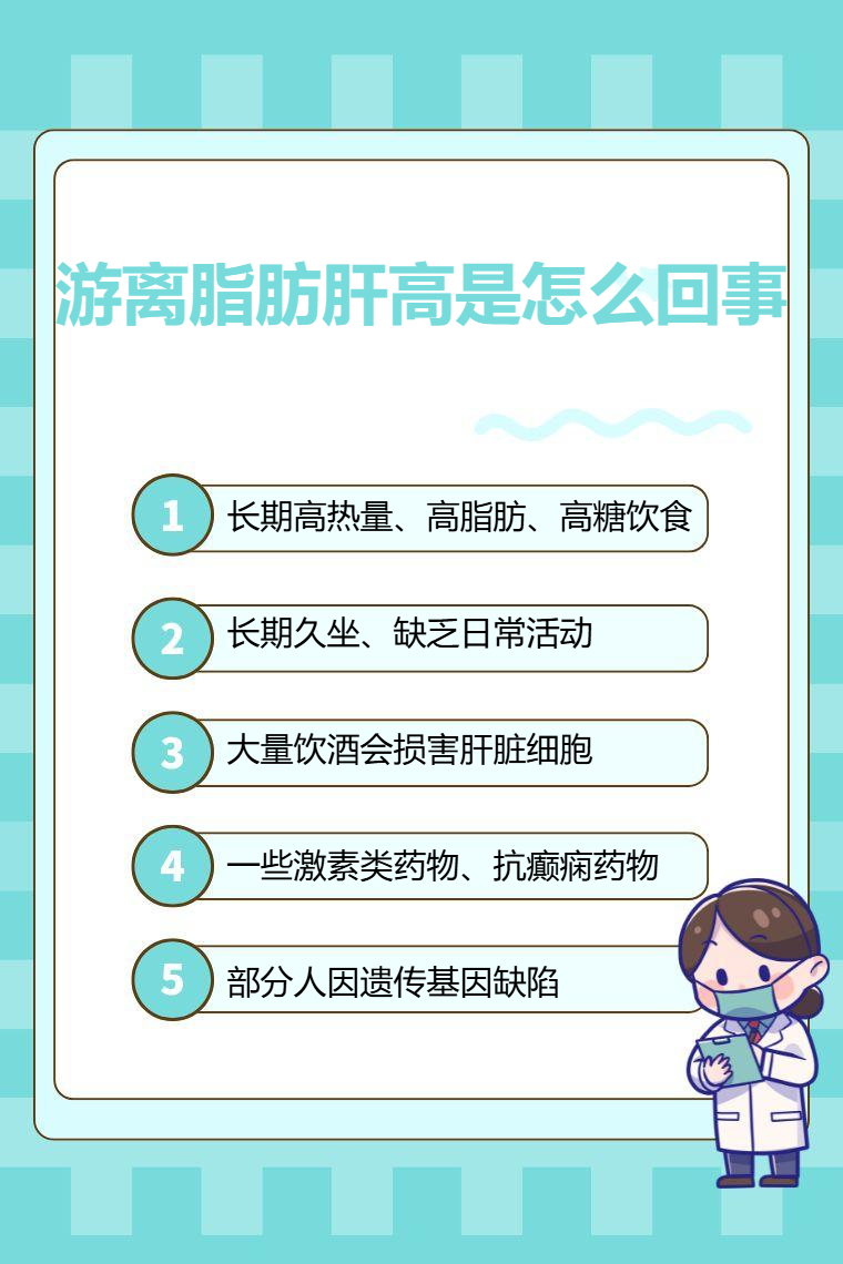 游离脂肪肝高通常由饮食不合理、运动量不足、酗酒、药物副作用、遗传因素等情况导致。
