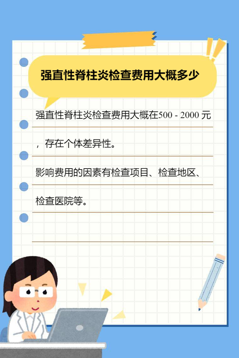 强直性脊柱炎检查费用大概在 500 - 2000 元,存在个体差异性。影响费用的因素有检查项目、检查地区、检查医院等。