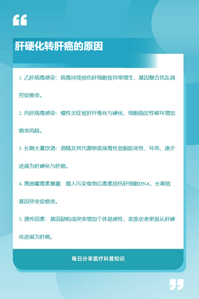 肝硬化转肝癌的原因包括乙肝病毒感染、丙肝病毒感染、长期大量饮酒、黄曲霉毒素暴露、遗传因素等。